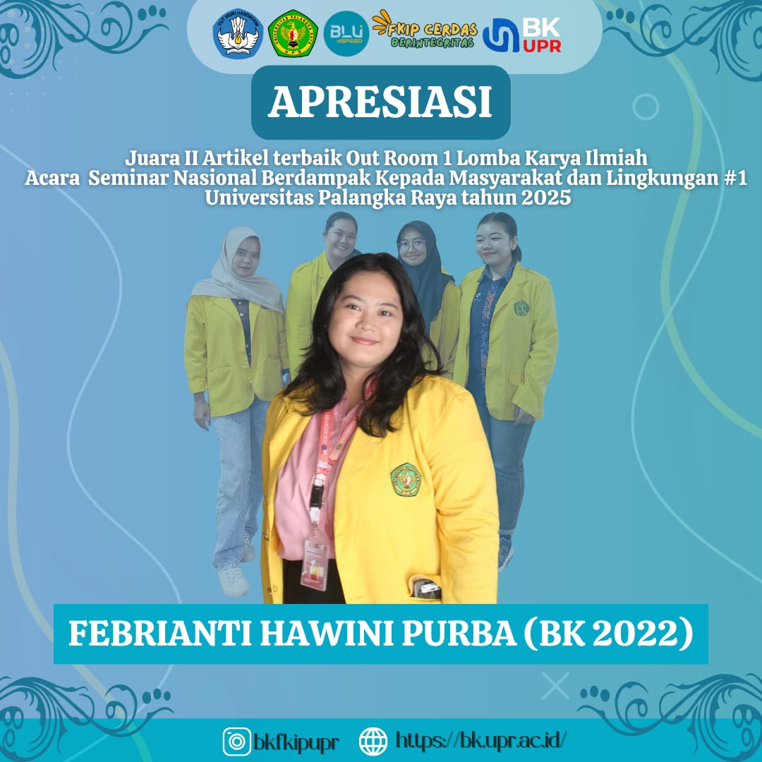 Mahasiswa Program Studi Bimbingan dan Konseling (BK) Universitas Palangka Raya kembali menorehkan prestasi membanggakan di kancah nasional. Dalam ajang Seminar Nasional Berdampak Kepada Masyarakat dan Lingkungan #1 Universitas Palangka Raya Tahun 2025, dua tim mahasiswa BK berhasil meraih gelar Presenter Terbaik dalam kategori Out Room Competition.